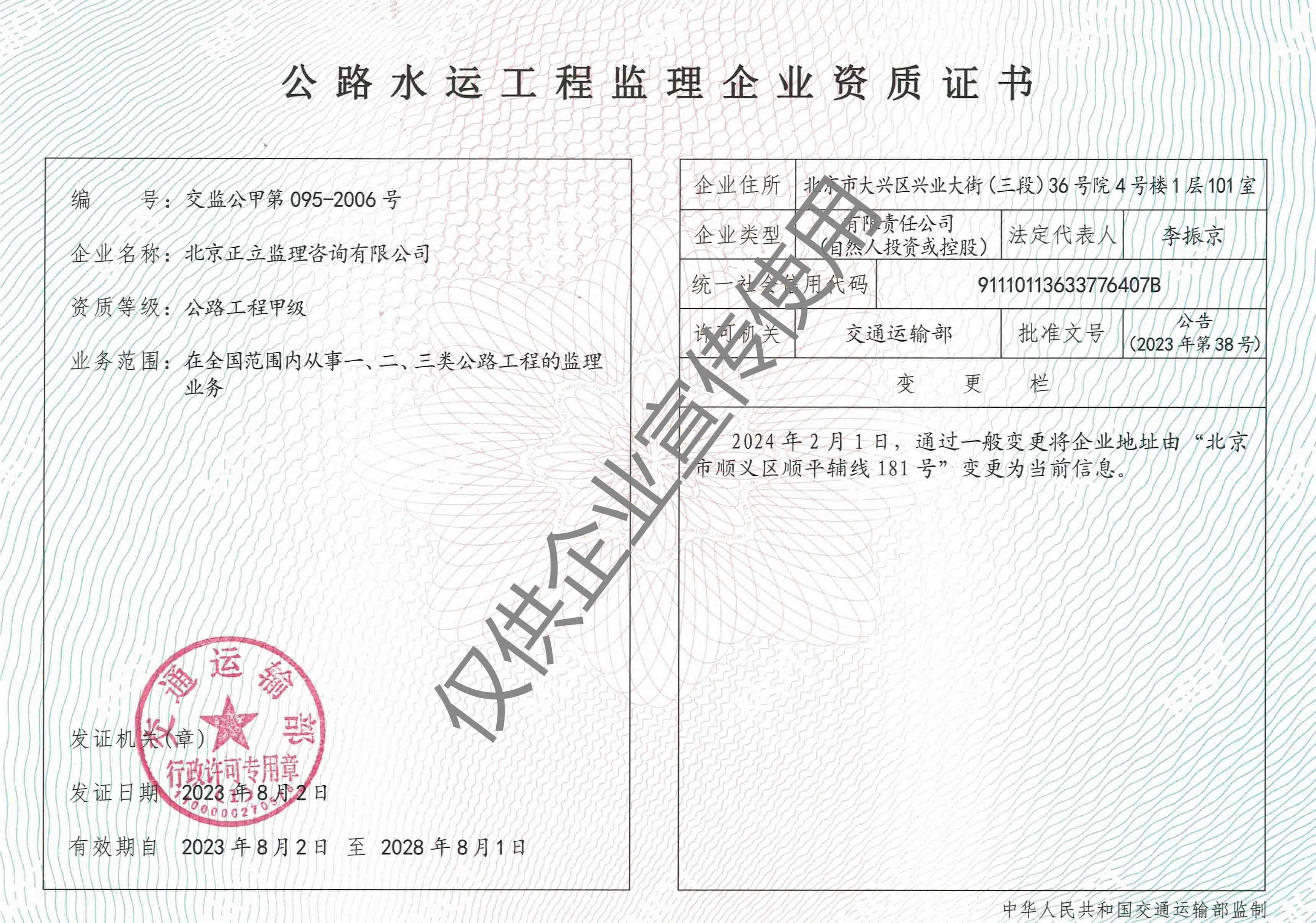 公司現(xiàn)為中國交通建設監(jiān)理協(xié)會理事單位,持有交通運輸部公路工程甲級資質、房屋建筑工程乙級資質、市政公用工程乙級資質、綜合檢測乙級資質。能夠承擔高等級公路、大型橋梁、隧道工程、房建市政的施工監(jiān)理及技術咨詢服務。